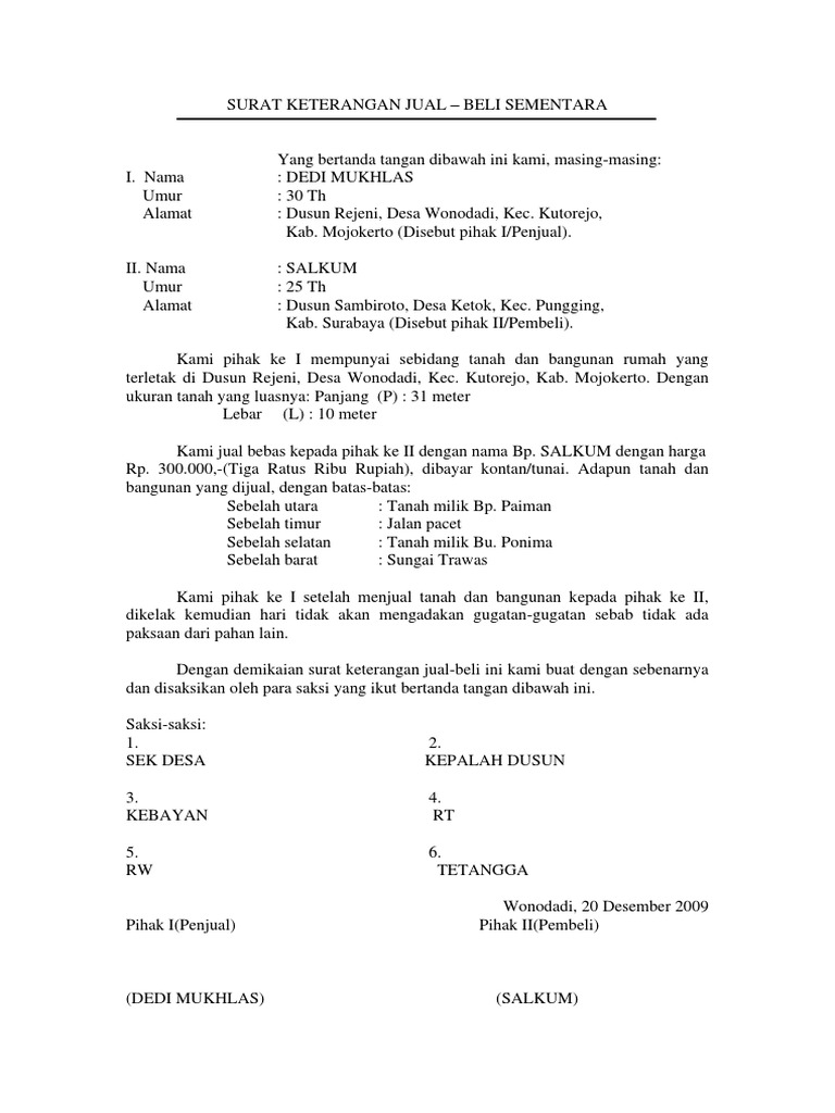 Surat jual beli tanah berfungsi sebagai bukti otentik dan mempunyai kekuatan hukum untuk menghindari surat perjanjian jual beli tanah ini dibuat bermaterai sebanyak dua rangkap dan ditandatangani nama : Contoh surat perjanjian jual beli rumah simak baik baik video ini ya.mari belajar sambil berinvestasi.link contoh surat perjanjian jual beli rumah (pdf). Diatas adalah contoh dari surat jual beli tanah yang baik dan benar yang bisa anda tiru atau contoh sebagai acuan dalam membuat surat tersebut. Dan ketika anda ingin memiliki barang atau harta tertentu surat perjanjian jual beli ini biasanya akan ditemukan pada proses jual beli tanah, rumah, mobil, sawah, kebun, sepeda motor, ataupun beberapa harta. Jual beli tanah tersebut dilakukan dan disetujui oleh kedua belah pihak dengan harga tanah sebesar rp 250.000.000,00 (dua ratus lima puluh juta rupiah). Bisa jadi tanah tersebut merupakan warisan dari orang tua dan ingin menjualnya, baru kemudian dilakukan pengurusan pengalihan pemilik dari tanah dimaksud. Rumah dan tanah bapak tukiran sebelah utara : Membuat surat keterangan jual beli memang menjadi keharusan jika kita akan melakukan hal hal yang perlu diperhatikan ketika membuat surat keterangan jual beli tanah ini yaitu contohnya: Surat jual beli tanah adalah surat yang dibuat dalam kesepekatan bersama antara pihak penjual dengan pembeli tanah, yang mana isinya memuat surat ini dibutuhkan tanda tangan kedua belah pihak diatas materai yang cuku guna melegalkan surat jual beli tanah. Surat perjanjian jual beli tanah. Surat perjanjian jual beli rumah. Surat jual beli tanah merupakan sebuah surat yang dibuat yang mana isi dari surat tersebut menginformasikan bahwasanya pada tanggal dan waktu tertentu telah dilakukan akad atau transaksi jual beli tanah antara pihak pertama dengan pihak kedua atau juga bisa disebut antara pihak penjual. Jadi, anda perlu mengetahui, apa saja jadi, anda perlu mengetahui, apa saja yang dibutuhkan atau isi dari surat perjanjian tersebut.